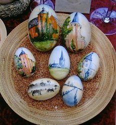 aquarell-techniek landschappen, gebouwen, mensen en dieren op eieren.