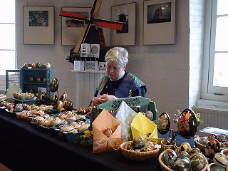 ook op eieren. Zij gebruikt oude motieven uit de Volkskunst waar veel