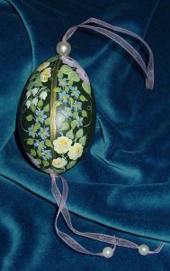 Wij ontdekten de eieren van Gisela Sassmann op een eierberus in haar woonplaats, het Duitse Neukirchen-Vluyn, vlak over de grens bij Venlo. Haar eieren met 'Bauernmalerei", een uit de middeleeuwen stammende volksschildertechniek, hebben een leuke, romantische uitstraling. Gecombineerd met linten om de eieren aan op te hangen of de bijpassende spanen doosjes, waren de eieren van Gisela Sassmann, te zien tijdens Kleinschalig 2007, ook erg leuk om kado te geven. |