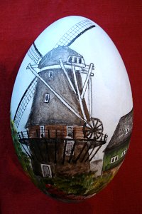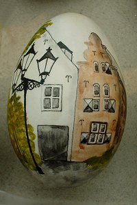 Verrassend zijn de eieren met stadsgezichten van deze eierkunstenares uit het Duitse Moers. Op originele wijze zet zij kerken, kastelen, grachtenpanden en bruggen in wat zij zelf "gemengde techniek" noemt, op eieren. Voor Kleinschalig heeft Hannelore leuke molen-eitjes gemaakt, en ook Amsterdam was goed vertegenwoordigd op haar tafel! In opdracht maakt Hannelore een mooi ei met bijvoorbeeld uw huis, een romantische trouwlocatie, of een ander gebouw waar u aan gehecht bent. |