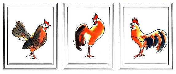 De vrolijke kippen en hanen van Hans Augustijn stralen u op Kleinschalig 2008 tegemoet. Hij werkt niet op eieren maar op papier en staat bekend om zijn landschappen, dorpsgezichten en moderne kunst, gemaakt met olieverf, aquarel en pen, maar bij ons in de molen hebben de kippen en hanen voorrang. Fraaie wandversieringen en leuke kaarten - u zult uw ogen uitkijken. Het is een bijzonder kleurig geheel aan zijn tafel, waar Hans waarschijnlijk ook aan het werk zal zijn. |