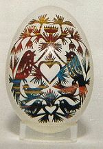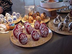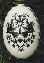 Toen ze oma werd begon Maria Stevens met het knippen. En dat knippen doet ze nu al meer dan 25 jaar, met veel succes. Met haar eieren-met-knipsels exposeerde zij 20 jaar lang op de bekendste eierbeurs van Europa: de Eiermärit in Bern. Zij exposeert niet vaak meer zelf, maar knipt nog wel veel. In 2001 was haar dochter bereid om met Maria's eieren naar de Molen te komen en in 2005 was ze er weer! |
