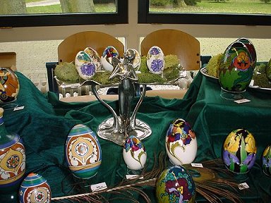 Zo kwam Ria vervolgens ook tot het beschilderen van echte eieren met de mooie oude patronen uit de Jugendstil en Art Deco periode. Aan de tafel van Ria Nobel is ook tijdens Het Feest van Herkenning in 2009 weer te zien dat eieren tot prachtige kunstwerken verheven kunnen worden! |