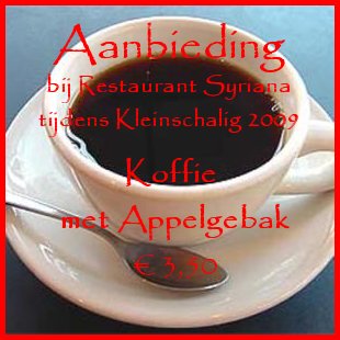 Speciale Aanbieding! Tijdens Kleinschalig 2009 serveerde het nieuwe restaurant naast de molen, "Syriana" een kopje koffie met appelgebak voor de speciale prijs van € 3,50. Bij Restaurant_Syriana kunt u tevens sfeervol dineren in de romantische serre met zicht op de Molen van Sloten. De keuken is Syrisch-Libanees en ze serveren er heerlijke maza's... |