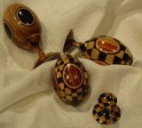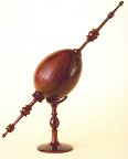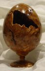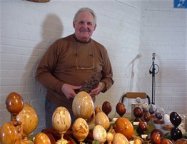 "Het eierwereldje steunt op hem" is de omschrijving die het beste bij Klaas Dikstaal past. Voor vele ei-versierders draait hij de "pootjes" en werk van hem is mede daardoor inmiddels in binnen-en buitenland te vinden. Maar hij maakt zelf ook eieren... van hout! Van allerlei houtsoorten, ook van oer-hollands hout worden de prachtigste exemplaren gedraaid. Zo vindt u onder andere eieren gemaakt van een "simpele" gouden regen en van appel- en perenbomen.Ook een oude taxus uit Amelisweerd verwerkte Klaas tot een ei, natuurlijk met bijbehorend "pootje". En u vindt bij hem eieren van exotische houtsoorten, te veel om op te noemen. Neem beslist de tijd voor "zijn" tafel, want als Klaas gaat vertellen over het inkopen, drogen, draaien en lakken van het hout komt U oren en ogen tekort! Overigens vindt u bij hem ook fraaie stolpjes en, zoals gezegd, onderzetters voor alle mogelijke eieren. In 2009 was Klaas Dikstaal voor de tiende maal op "Kleinschalig" aanwezig in de Molen. Natuurlijk omdat hij prachtige onderzettertjes maakt om een pasverworven ei op te kunnen zetten, maar vooral om de meesterlijk gedraaide eieren uit allerlei houtsoorten. |
